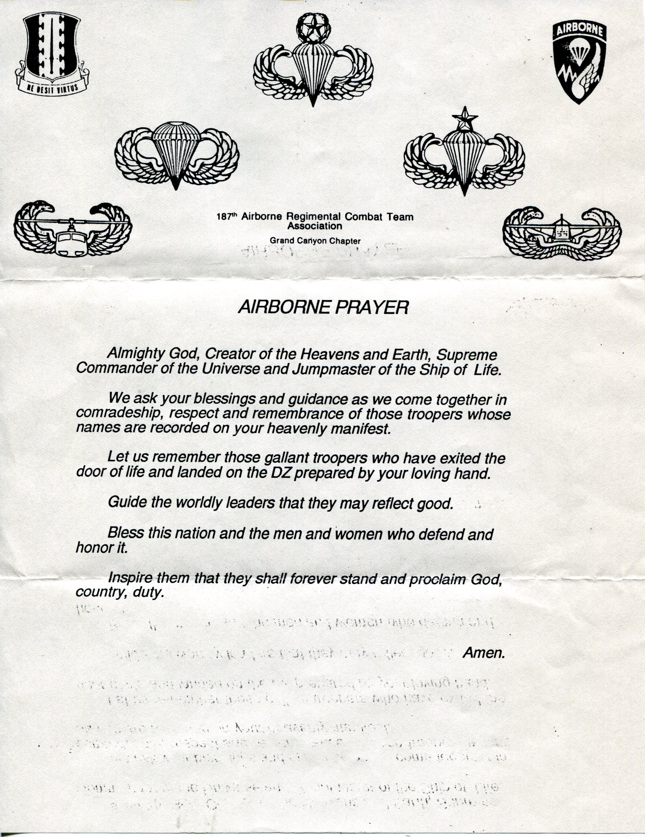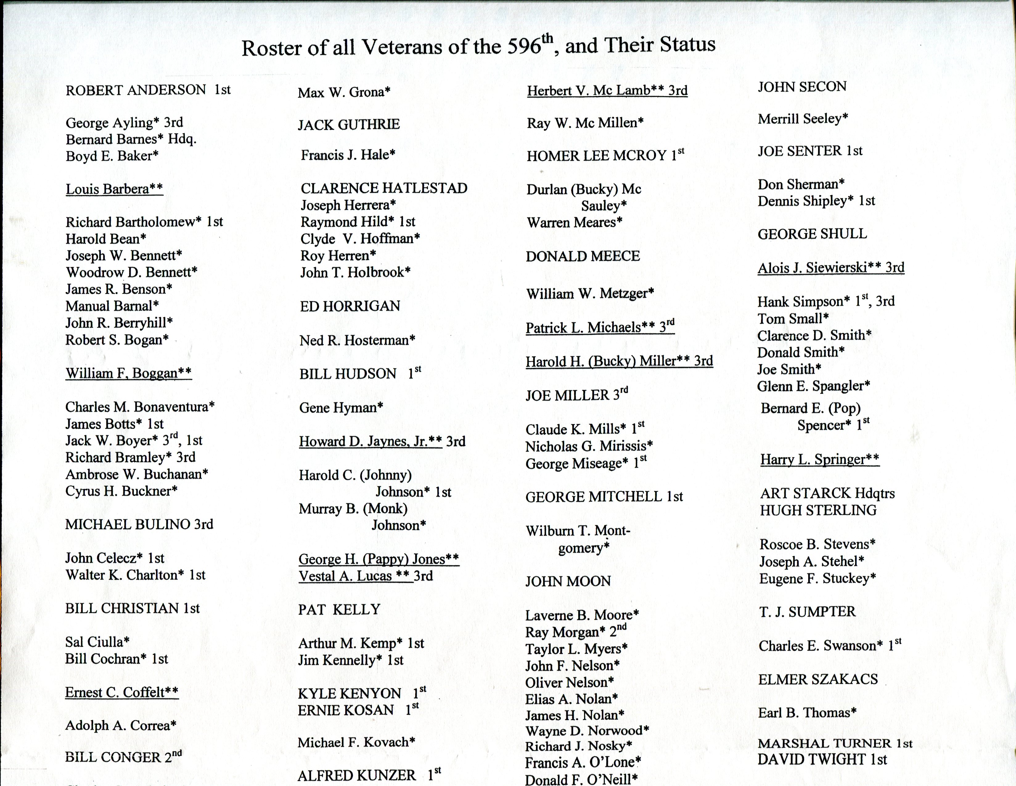 - He was part of the 542nd Parachute Infantry as that is listed on his discharge papers, but the newsletters and documents saved reference the 517th Parachute Infantry Regiment; 460th Parachute Field Artillery Battalion and 596th Parachute Combat Engineer Company – see links below for reference