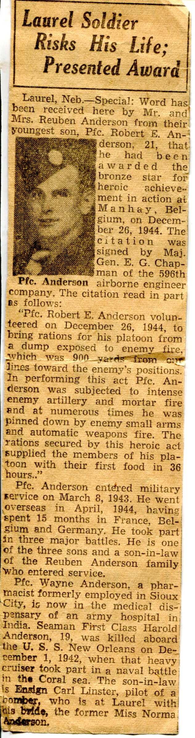 Here are links to some of the vmail letters and other things Bob wrote to home along with some newspaper clippings – some we know the source on, others are assumed to be the Laurel NE paper and those are not yet online for searching