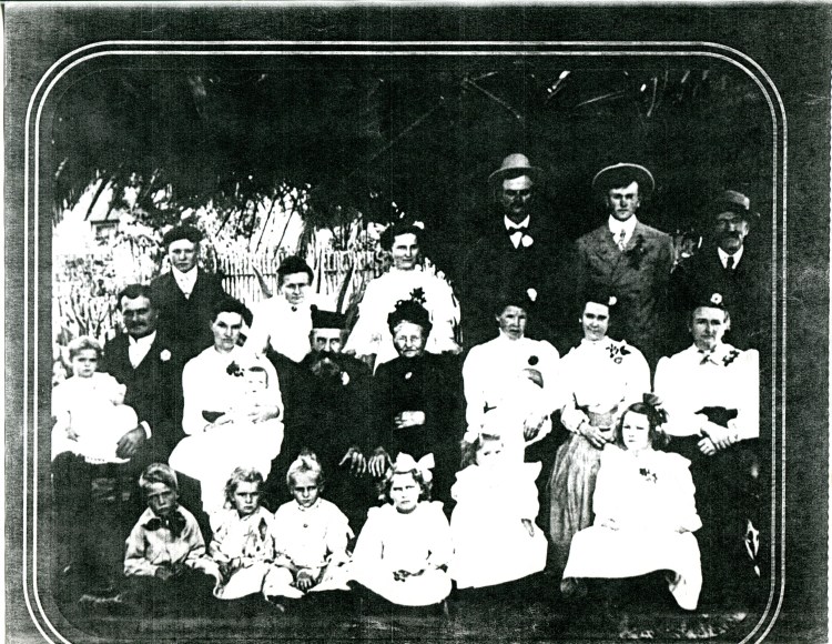 Middle Row, L-R: Rose Moeller (on lap), Henry John Moeller, Emma C Moeller, Rudolf Moeller (on lap), Henrich Otto Wolpers (second husband of Anna Moeller), Anna (Moeller) Wolpers (mother of Charles the subject of this piece), Jeannie Moeller, Hannah Moeller, (baby on lap unknown), Emma Hemme