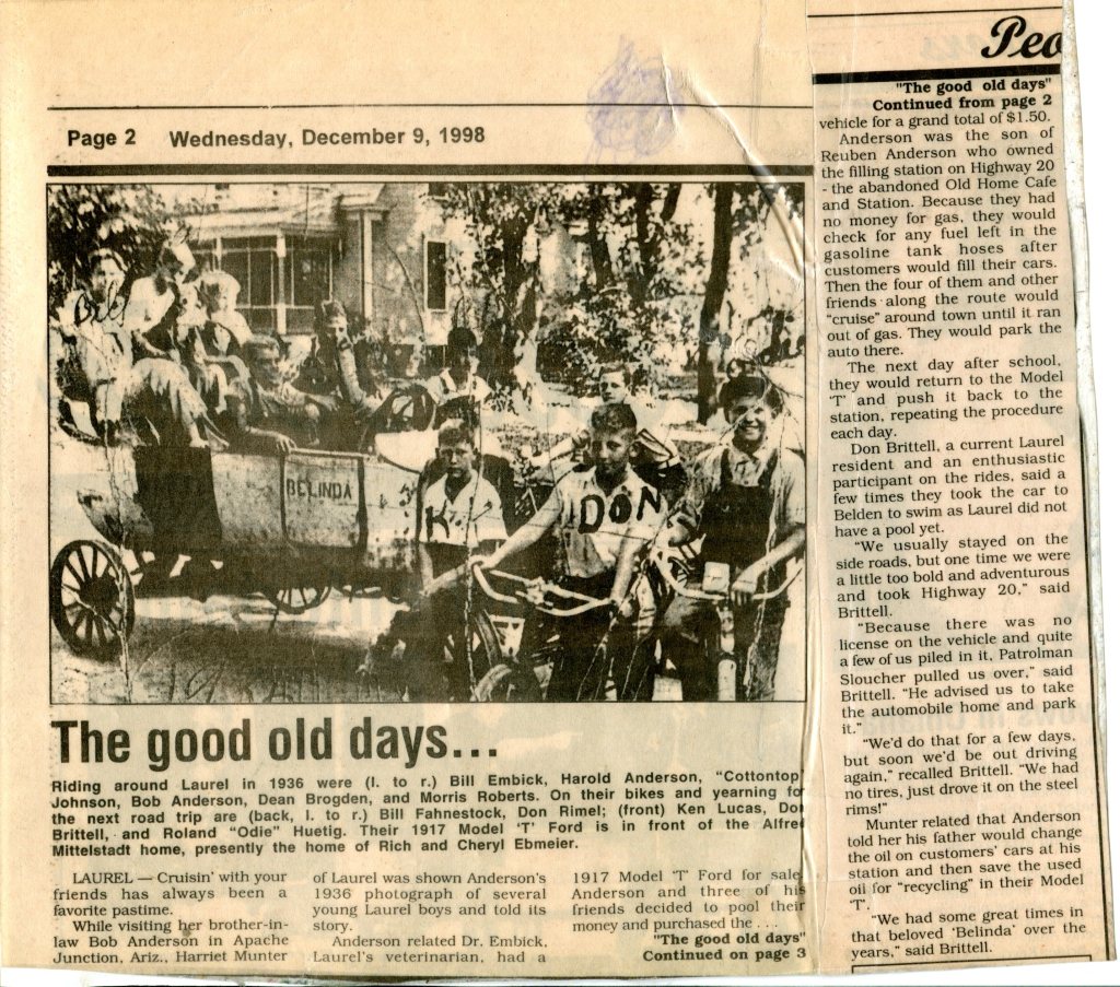 One of my grandpa Bob’s favorite stories to tell was of “Belinda” the car. Bob and some friends had an old 1917 Model T Ford that they purchased for $1.50. They had no money for gas, and would check for any fuel left in the gasoline tank hoses and would cruise around on whatever gas they could find. When they ran out of gas they would “park” the car where it was. They would push it back to the station the next day and try again. It sounds like they had a lot of fun and adventure with Belinda!