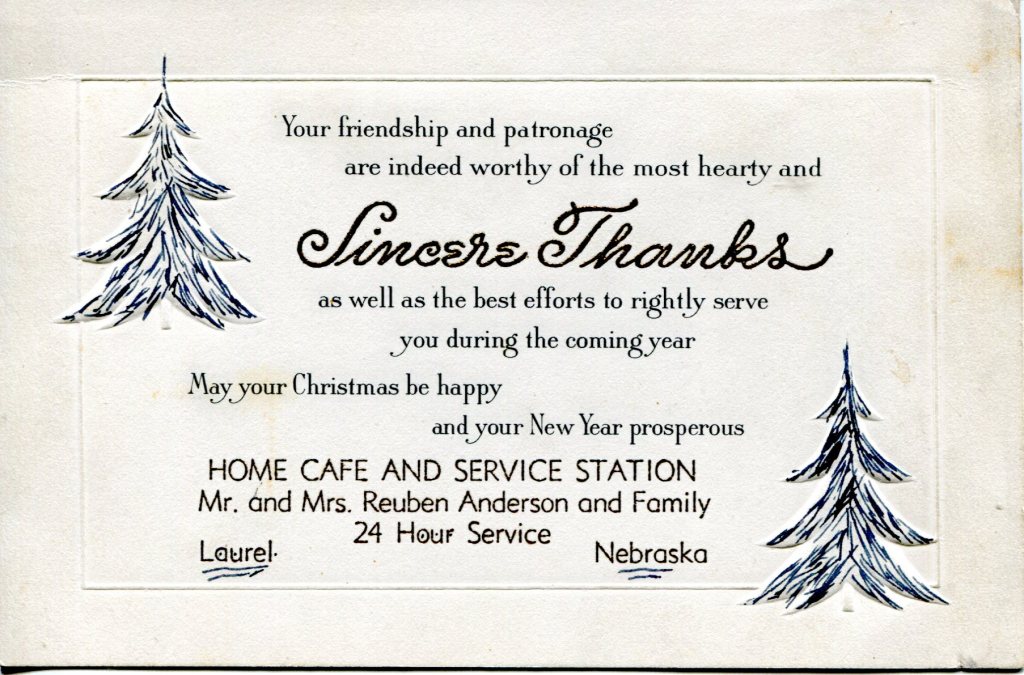Reuben and Gladys, my maternal Great Grandparents, owned and operated a service station and cafe in Laurel, Ne for many years. The best time frame I have is from the Cedar County, NE History. From there we learn that Home Oil Company was owned and operated by August Weseloh in the early 1920’s and was later purchased by Charles Ebmeier who employed Reuben Anderson. Home Cafe and Service Station was later built on Highway 20 and was a successful truck stop managed by Reuben and Gladys. In 1944, Reuben Anderson purchased the Tom Norris property and constructed a new service Station that I believe was Anderson’s Deep Rock, which was later purchased by Lester and Ella Bartels in 1959.