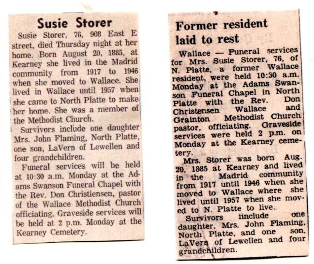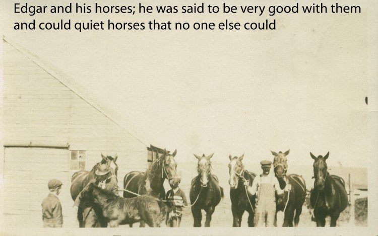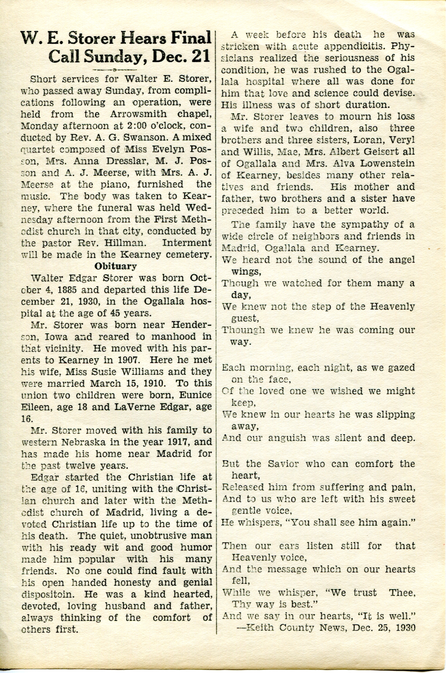 I have some information on their siblings as well that is interesting. One worth noting is Walter’s brother Uriel. I have a photo taken at his funeral service when he died at 18 years old. The back says: “His mother said she would rather see him dead instead of where he was headed, He must have been a wild one!” Another of Walter’s brothers, Veryl, owned Edgar’s jewelry store in Ogallala, NE. The family has bought many things there including Cory and Nicole’s wedding registry gifts and Nicole’s wedding ring.
