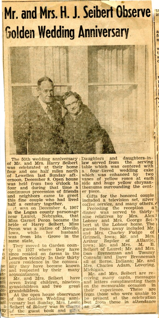 Harry Jonas Seibert and Garnet Hazel Peron are Cory’s great grandparents on his maternal side and the parents of his grandmother Mildred Seibert. I don’t have much on this couple and they have a sad story to tell. Both of them were “orphaned” at young ages. Garnet’s mother died when she was 5 and her father died when she was 9. I need to do some additional research on her family to find out some more details. Harry has a similar story. His mother died when he was about 3 years old and his father died when he was 27.