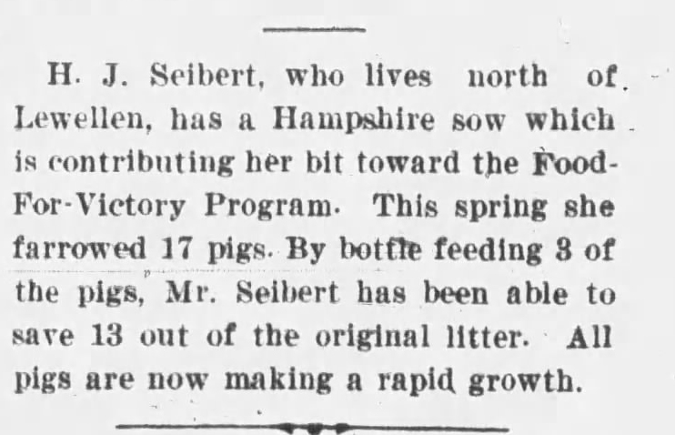 1942-06-04 – Lewellen_Times_Thu__Jun_4__1942_HJ Seibert sow farrows 17 piglets