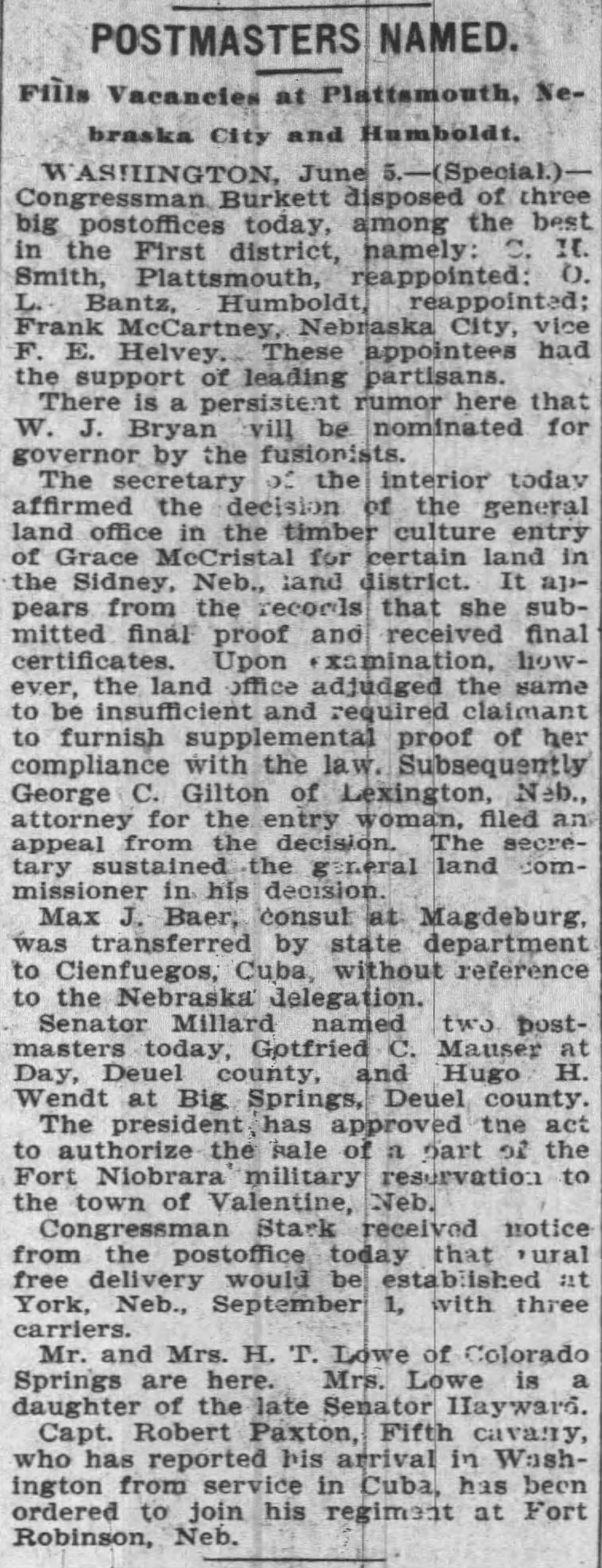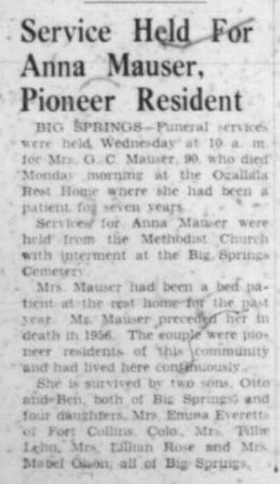 To supplement some of the information in the biography here are a few items. Gottlob settled his land as part of the Homestead Act, while Anna’s mother had ground as part of the Timber Claim Act. If you look at the piece of ground that was part of the timber claim act on the map in the biography document I don’t think there’s a tree to be found. History Nebraska notes that this was a pretty unsuccessful act for a number of reasons.