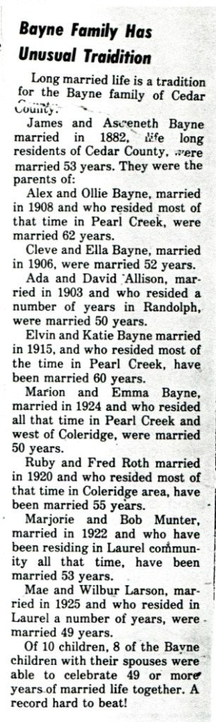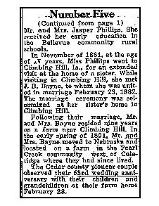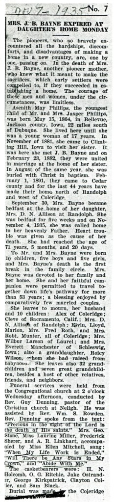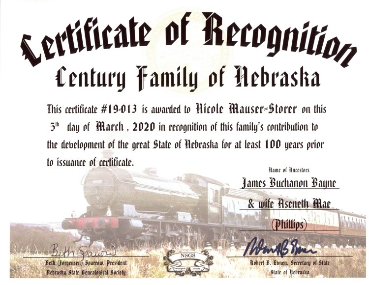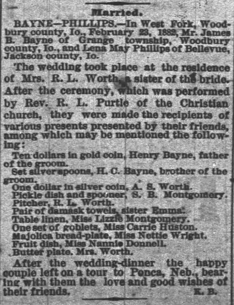 James Bayne was born in Vevay, Switzerland County, Indiana. He then moved to Woodbury County, Iowa and then Cedar County, Nebraska. Aseneth Phillips was born in Jackson County, Iowa and then lived in Woodbury County and Cedar County.