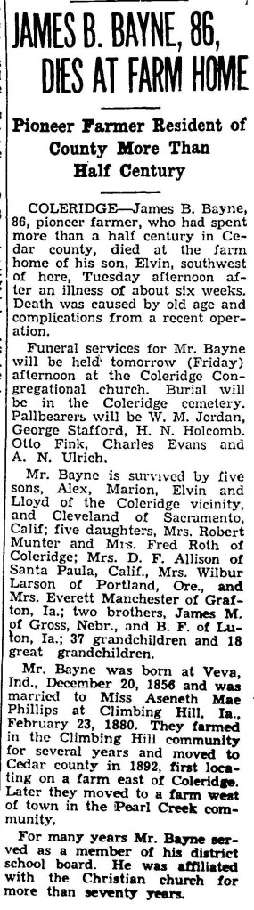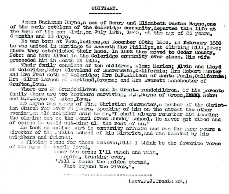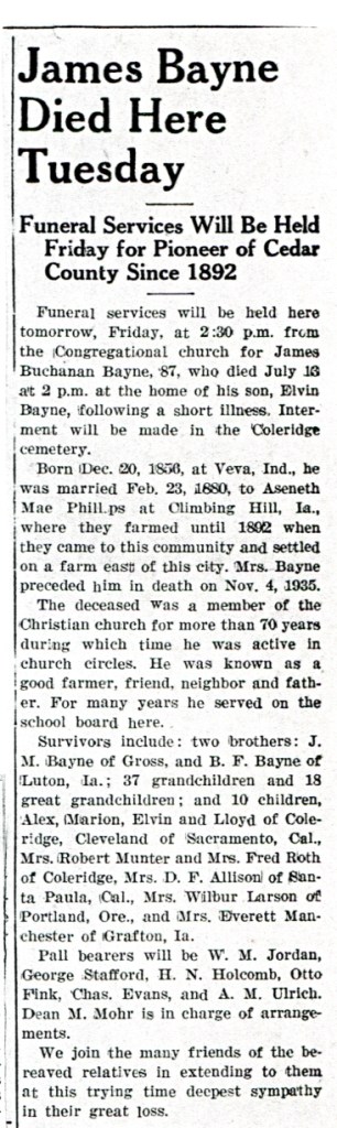 1943-07-15 -James Bayne – Obituary – Page 1 of Cedar County News,published in Hartington, Nebraska