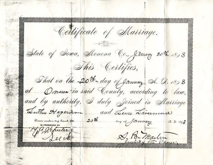 Luther Hagerdon & Lena Livermore Marriage Certificate