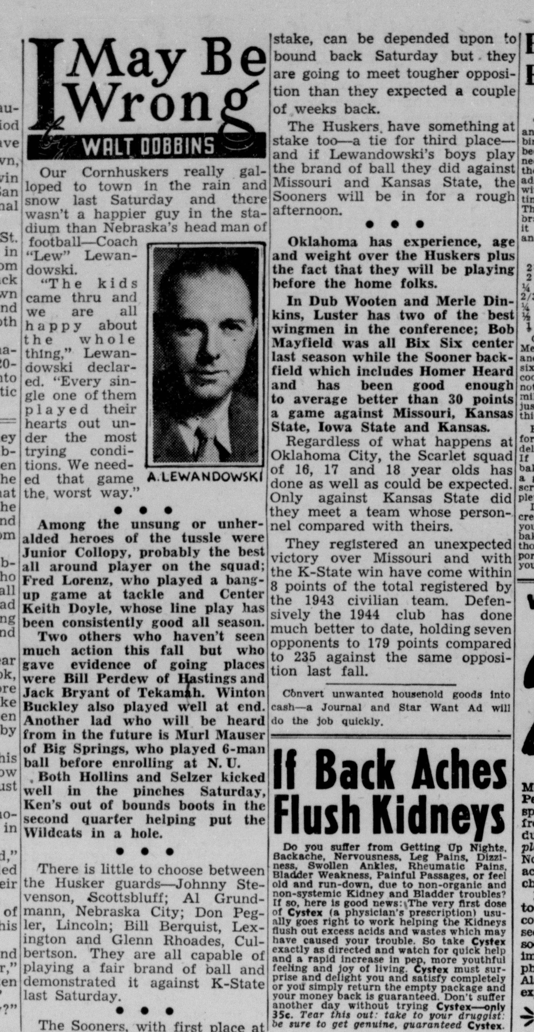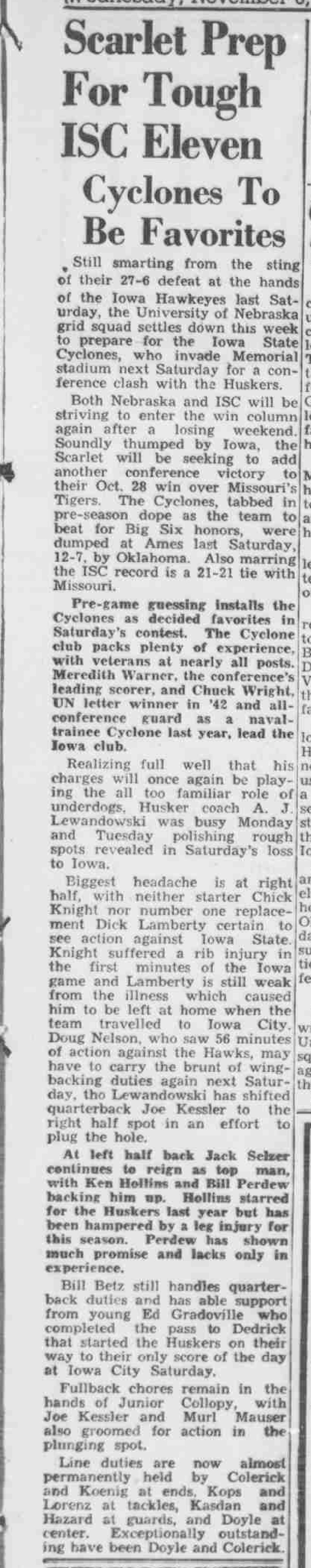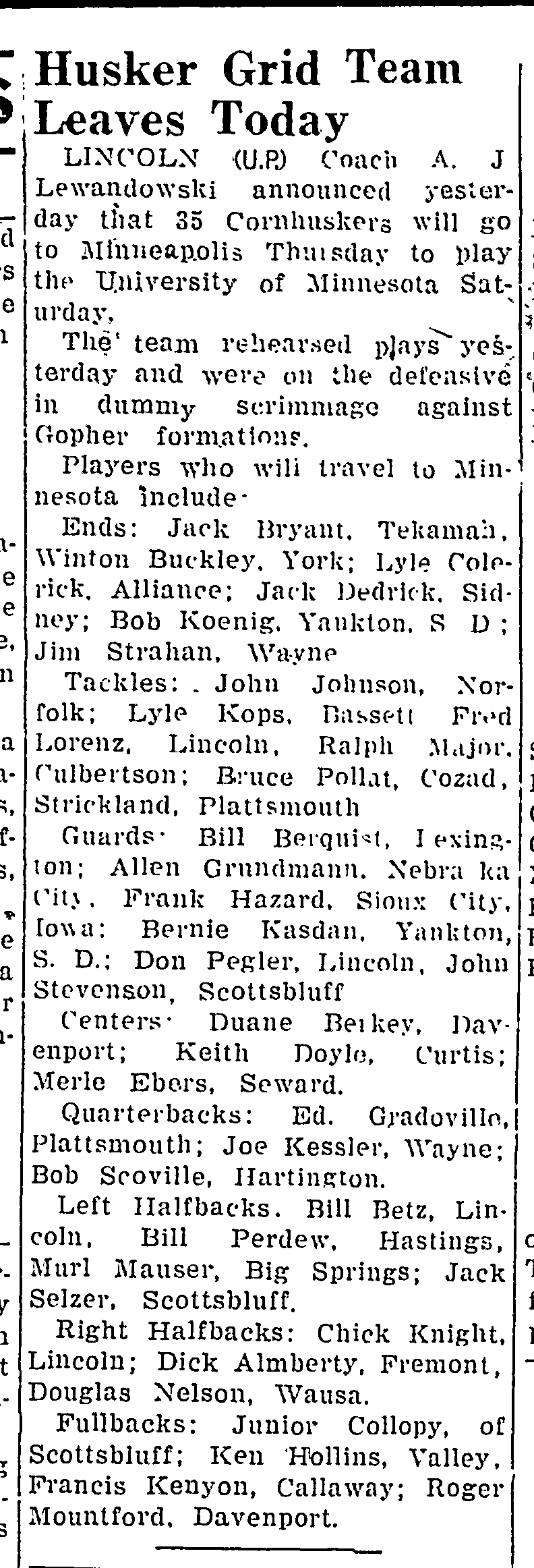 - 1944-09-28 – North Platte Daily Bulletin, Murl Mauser travels with Huskers to Minnesota