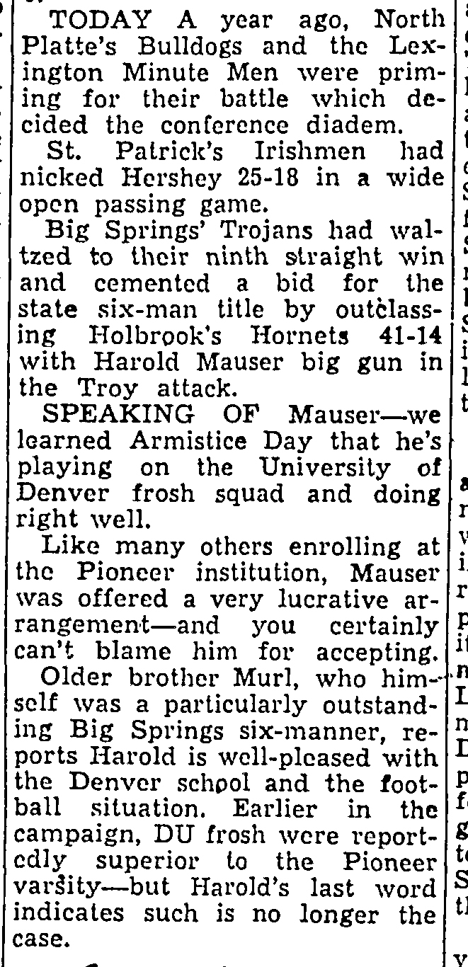 - 1948-11-13 – North Platte Daily Telegraph Bulletin, Harold Mauser College Football