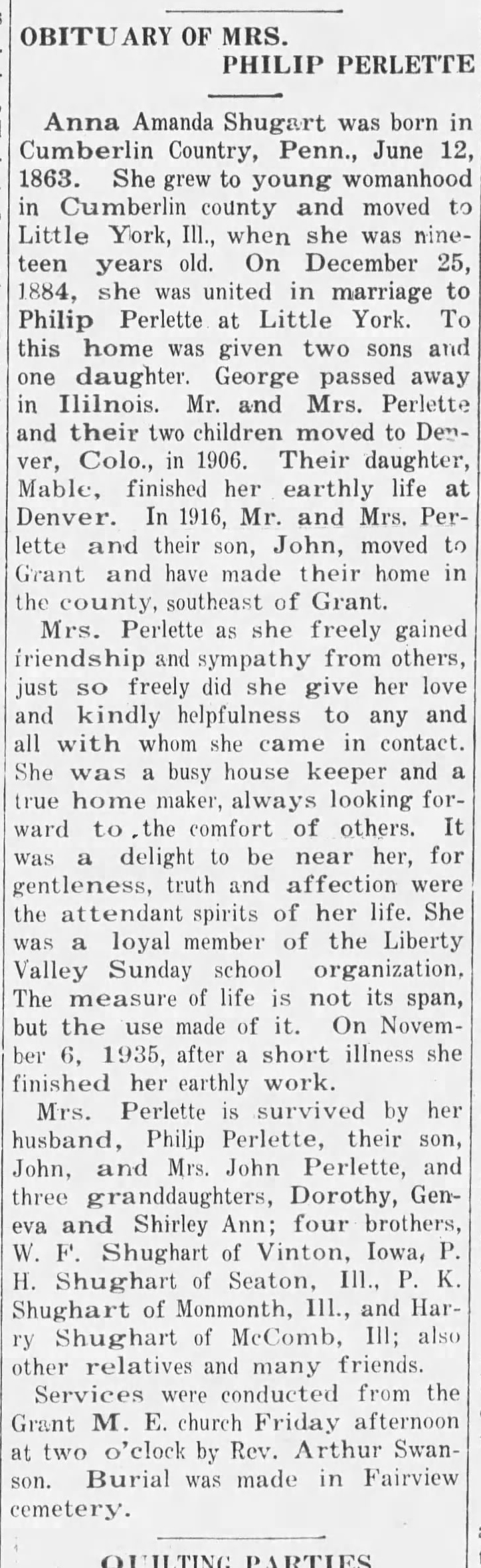 1935-11-14 – The_Tribune_Sentinel_Thu__Nov_14__1935_Anna Shughart Perlette Obituary