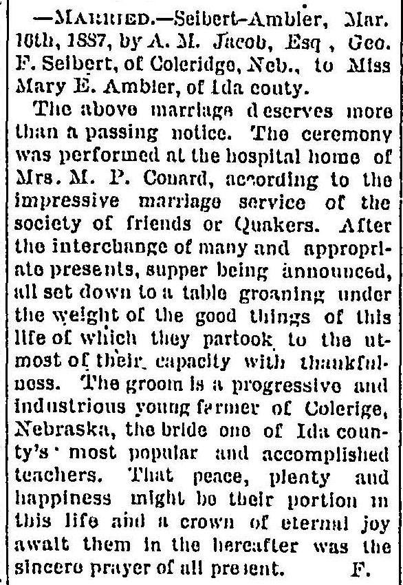 1887-03-24 – Maple Valley Era, Page5, 1887-03-24 George Seibert Marries Mary Ambler