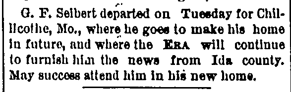 1895-02-14 – Ida Grove Era, Page5, 1895-02-14 George F Seibert – moves to Chillicothe, MO