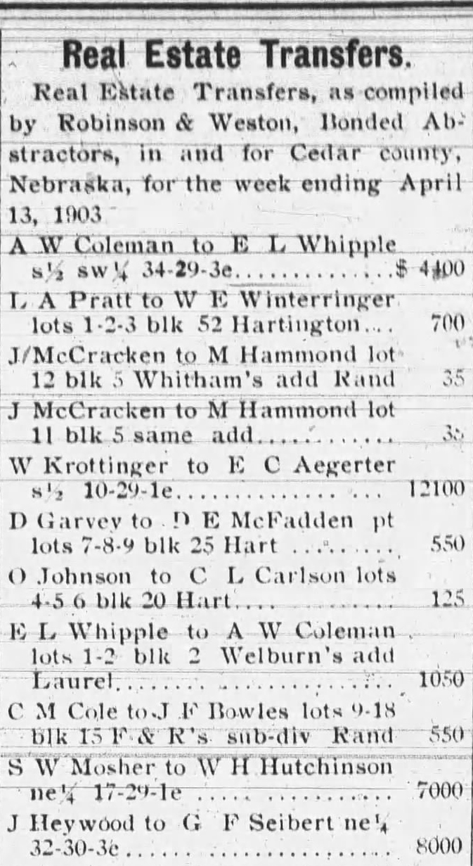 1903-04-16 – Cedar_County_News_Thu__Apr_16__1903_Heywood Land Transfer to GF Seibert
