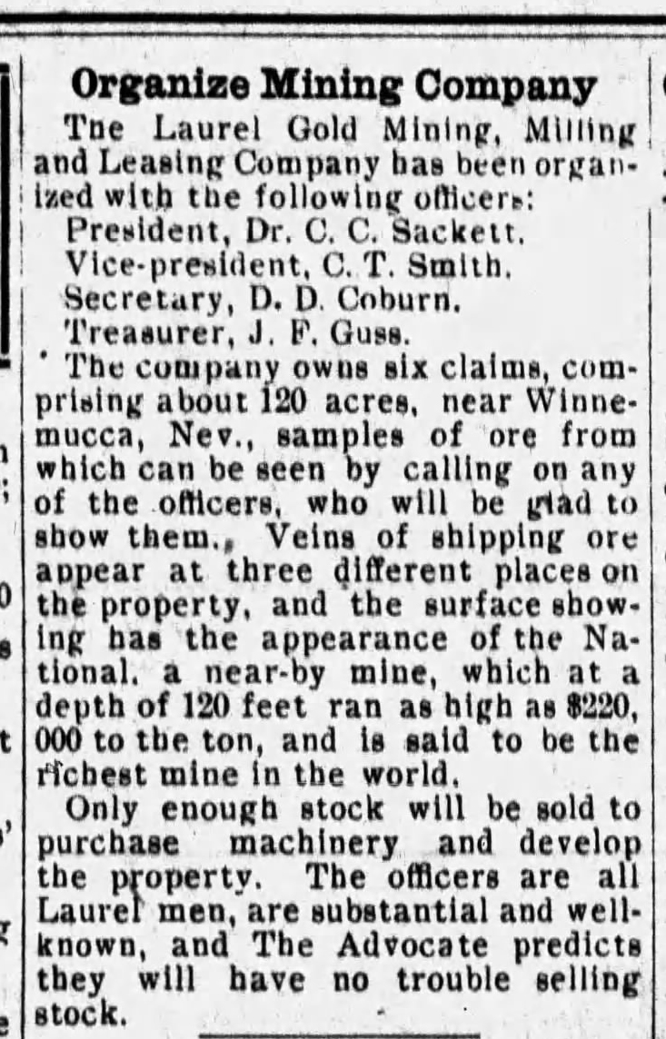 1909-06-10 – The_Laurel_Advocate_Thu__Jun_10__1909_Organize Mining Company