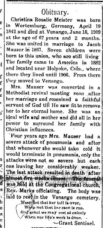 We know that Johann Jacob was born in Burgstall, Germany and died in Venango, Nebraska. His first wife Eva Katharina was born and died in Unterbrüden, Wurtenburg, Germany. Johann Jacob then married Eva Katharina’s half sister who came with him to the United States and died in Amherst, Colorado.