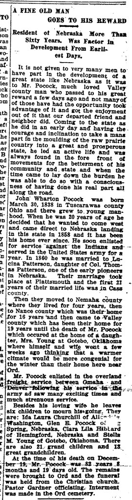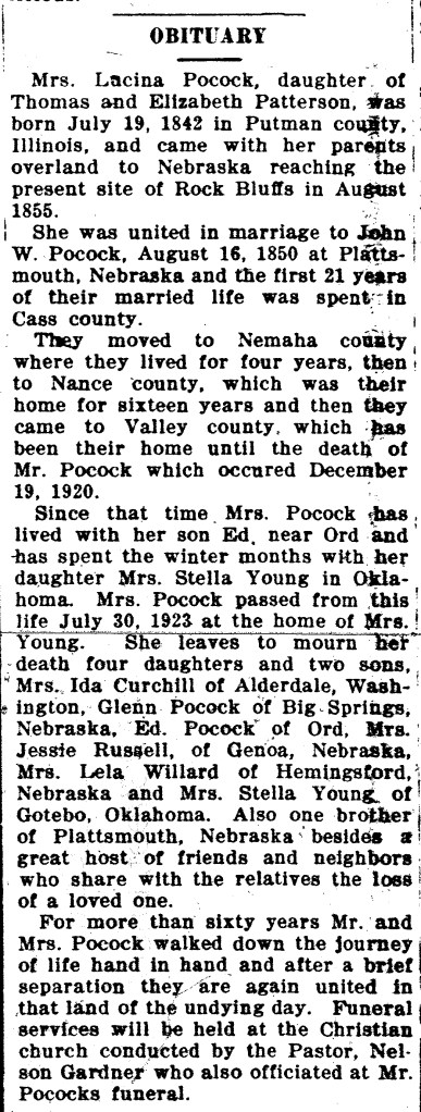 1923-08-02 – Lucina Patterson Pocock Obituary – Ord Quiz