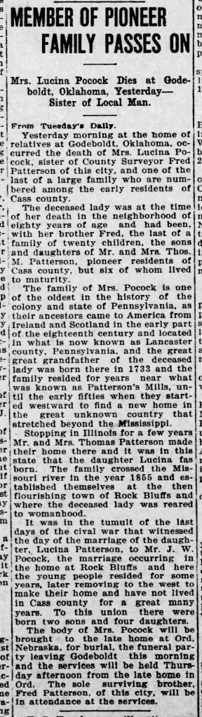 1923-08-02 – The_Plattsmouth_Journal_Thu__Aug_2__1923_Lucina Patterson Pocock Obituary