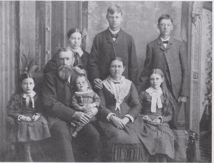 John Pocock Family Found by Judy Donahue the following written on the back – Ceney and John Pocock (sister to Fred Patterson), l-r Jessie, Ida, Stella, Glen and Ed, Lela Abbott Peru and Brownsville, Ne