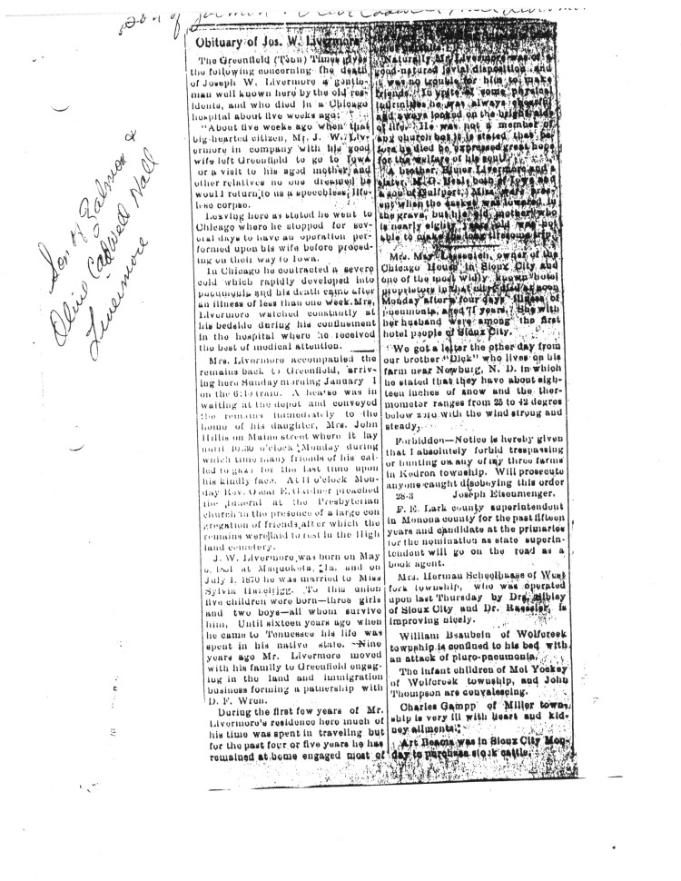 Joseph William Livermore and Sylvia Hazelrigg are the parents of my 2X Great Grandmother Lena Livermore and the grandparents of my Great Grandmother Gladys Hagerdon Anderson. The Livermore family has been fairly well traced and was a well respected family in Maquoketa, Iowa.