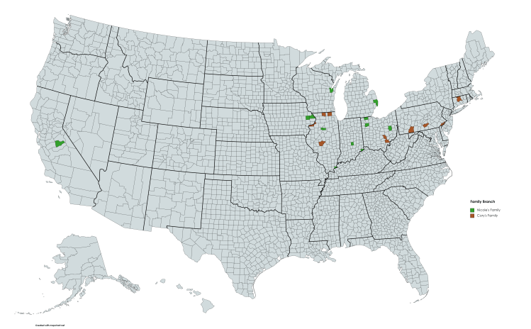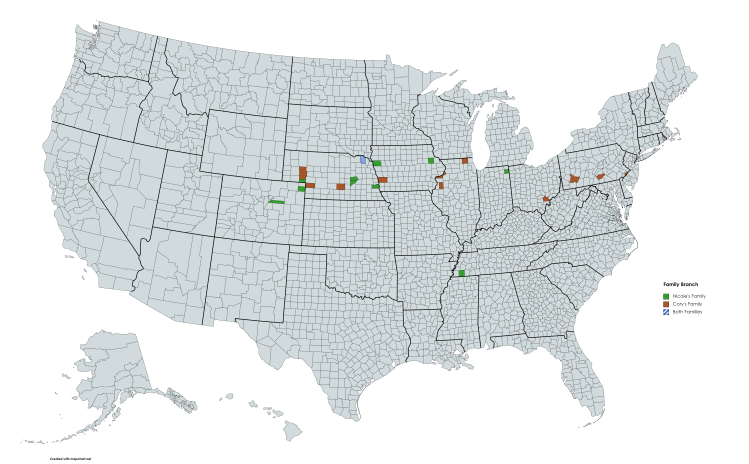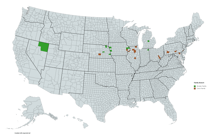 As I wait for some details on a few of the branches of the family tree I thought it would be fun to see where our families were over the course of time. I took the Federal Census data and mapped locations over time. The most recent Federal Census that is available to the public is the 1940 census, so I started with that one. I then went back in time to the 1850 census and stopped there for a couple of reasons. One being that for most branches of the tree some of my data isn’t as complete at that point, and the other is that prior the 1850 the census only lists the head of household and not the family members, so accuracy is harder for some of the branches that I’m still working on. This is specific to folks in the United States only and there are some branches that are still being researched that aren’t included at this point. Regardless it was fun to see the migration patterns. Each of these maps shows my family tree branches in a green color, Cory’s family branches in a brownish color and any counties where they are both represented in a blueish color. I’m also including a legend in a PDF file that shows which families are in which county for reference. Hopefully I’ll have an opportunity to put an animation to this at some point.