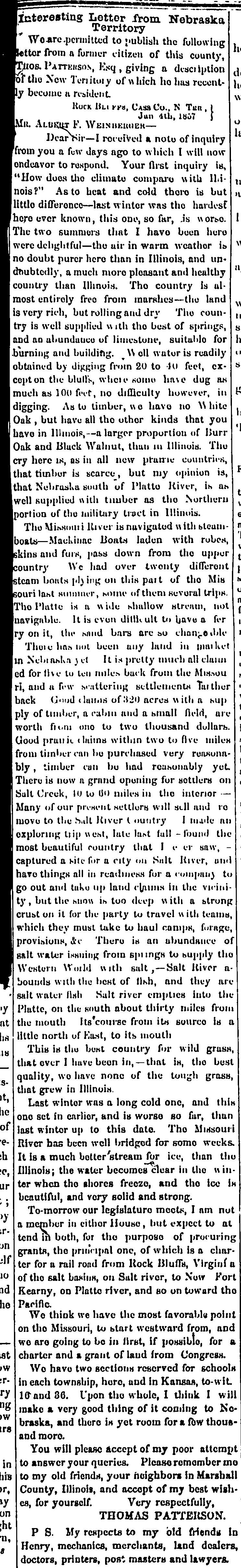 Thomas surveyed the town of Magnolia, IL in 1836. This is the oldest settlement in Putnam County, and the Black Hawk wars of the area just ended in 1832. From there the family went to Rock Bluff, Nebraska just after the Nebraska Territory opened in 1855. Rock Bluff is no longer a town and Plattsmouth, NE has grown up where Rock Bluff was.