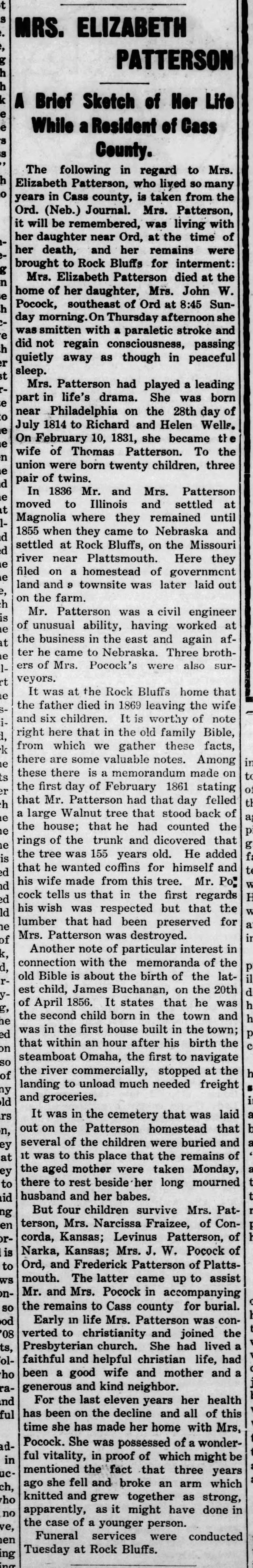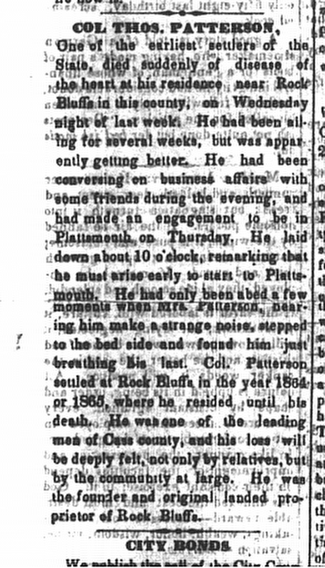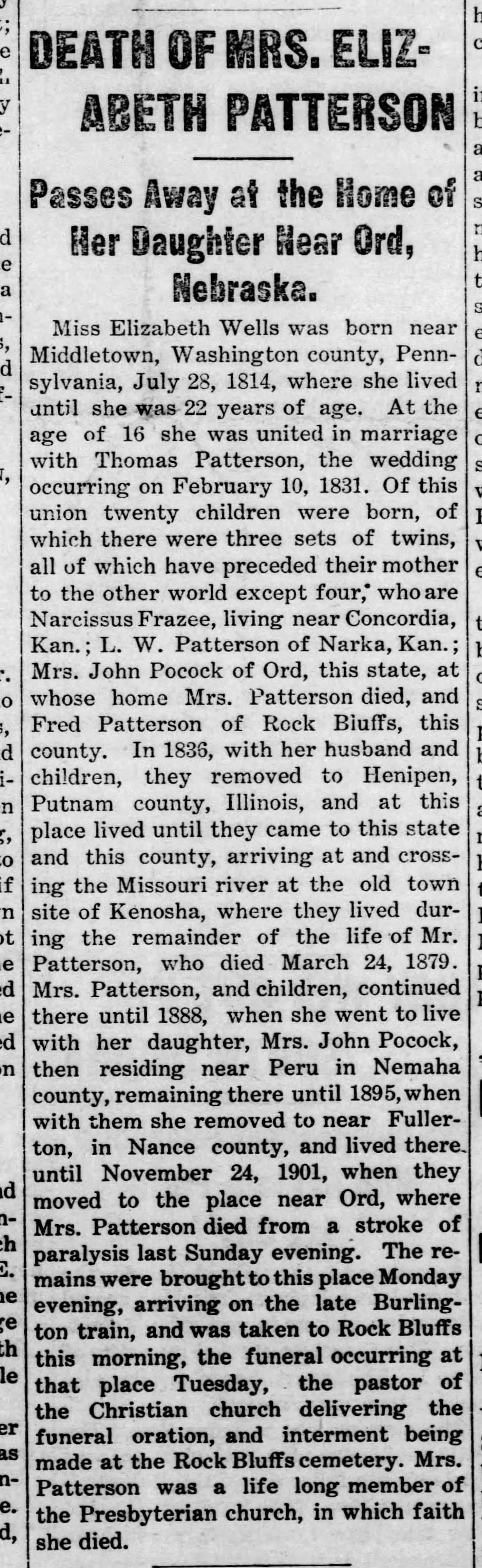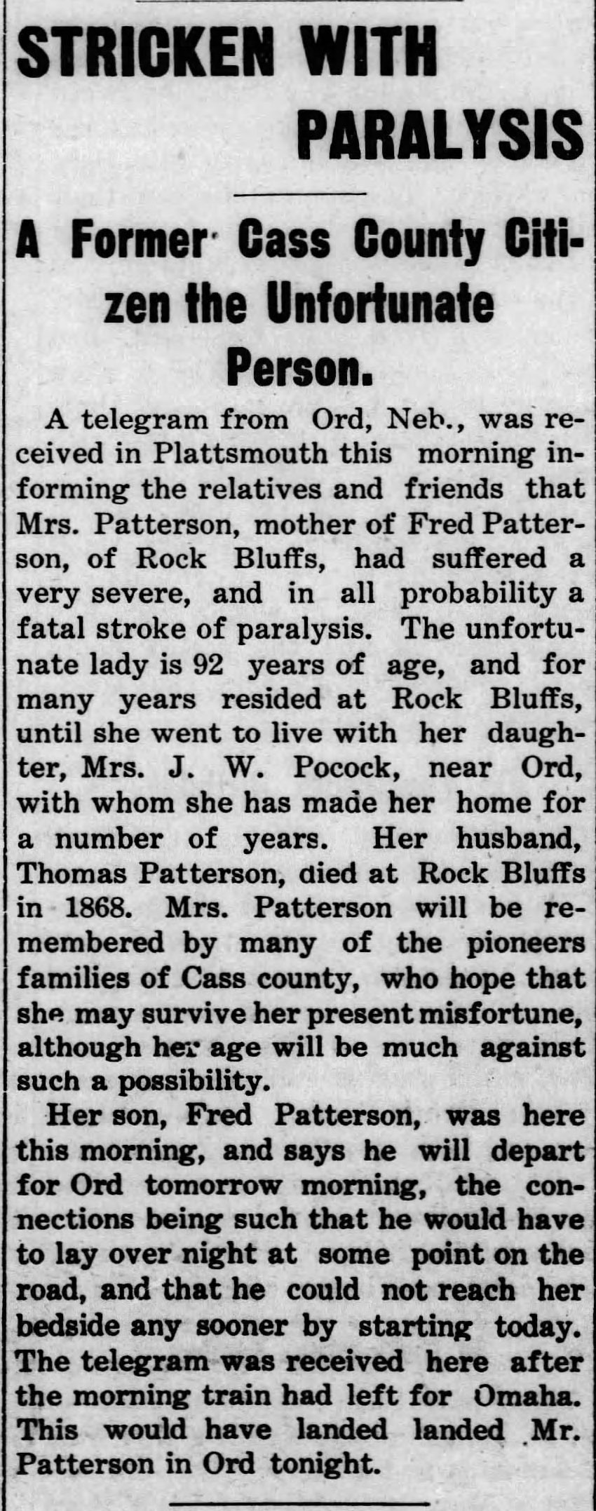 This family left their Bible record with the Cass County Historical Society, so we have records of all the births and deaths in the family. Their youngest son Fred Patterson was murdered in Rock Bluffs in 1931 for the statement that he knew who had committed an earlier murder in the town. I’ll include the newspaper story in the images below for anyone interested.