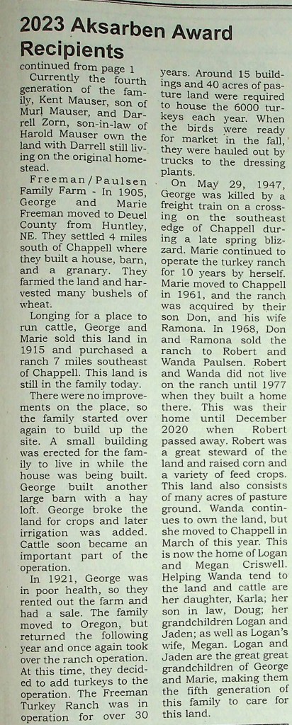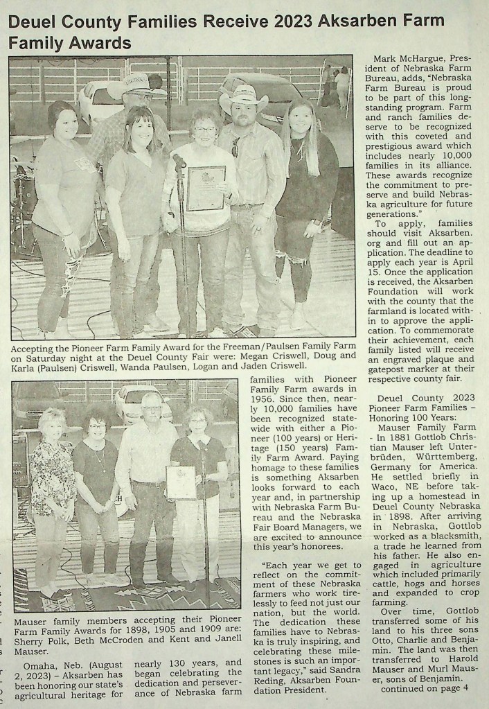 We had an exciting moment in August at the Deuel County Fair. All the paperwork was filled out with Aksarben, and the Mauser family was awarded the Pioneer Farm Family. That means that a member of the family has lived on the same property for 100 years (or more). In this case we were able to recognize Gottlob Mauser’s original homestead property from 1898, the parcel where my parents live (1905) and where Grandma lives (1909). We didn’t fill out the paperwork to mark the exact 100 years as you can tell, and most of these properties are closer to the 125 than the 100. There is also a Heritage Farm award for parcels that remain in the same family for 150 years. We will see if the family is still on the same ground in 2050!