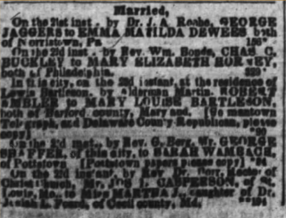 Public Ledger, Philadelphia, Pennsylvania, 26 February 1857, page 2, column 3, Married Robert Ambler – Mary Louise Bartleson; image, Public Ledger (https://newspapers.com/: accessed 10 February 2026)